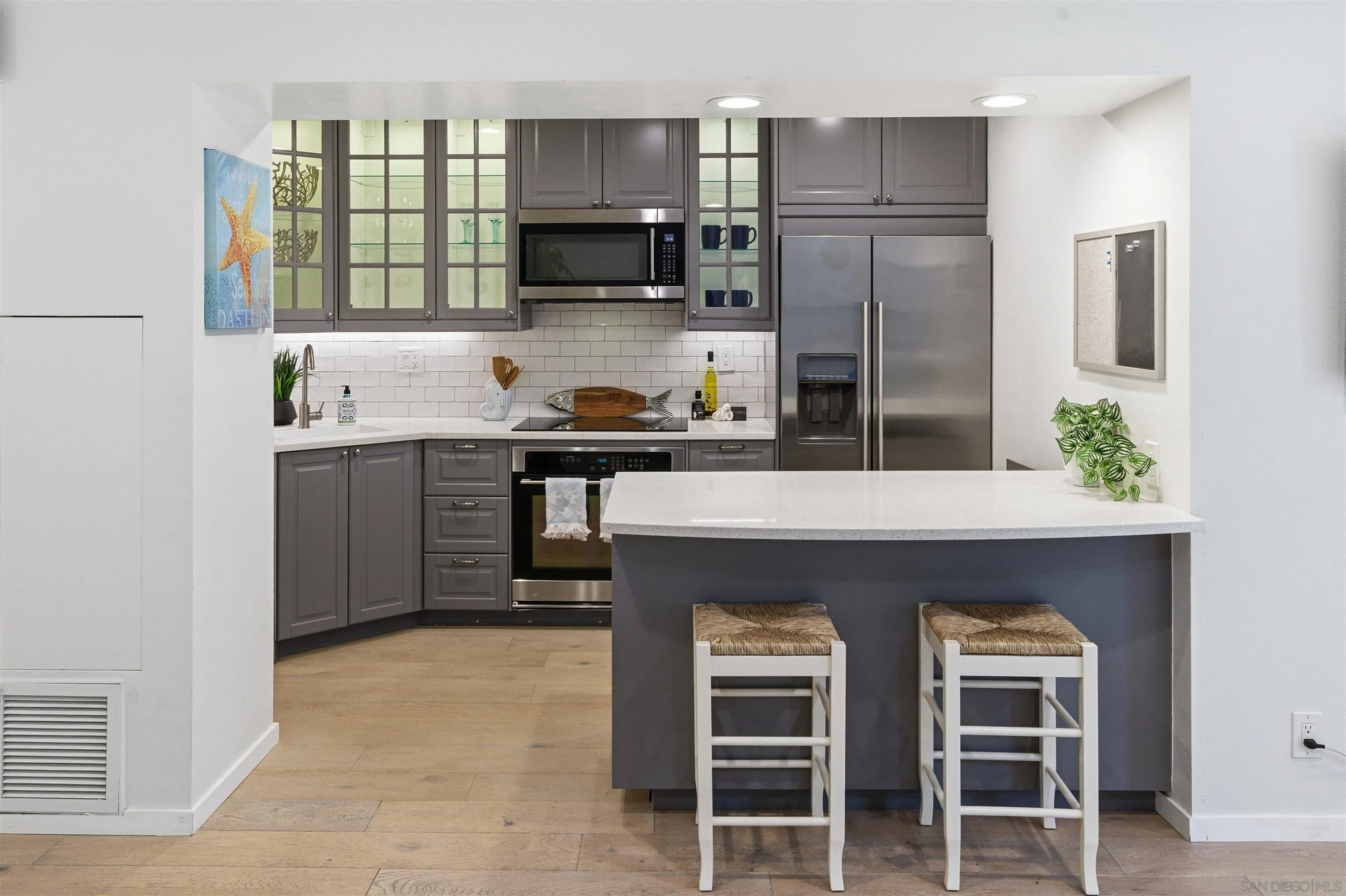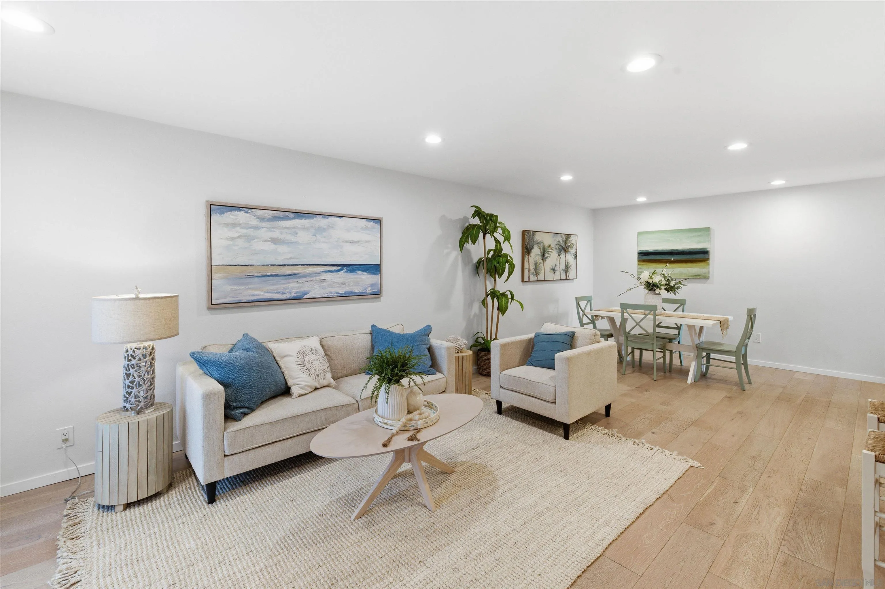 Seller's concession:seller's goal was to complete 1031 exchange, which this quick sale accomplished. Experience panoramic whitewater & ocean views from this intimate bluff-front complex located west of Coast Hwy 101! Spacious, & beautifully remodeled 2 bed/2 bath residence offers stunning views from primary living area & primary bedroom, plus the two ocean view decks! In-unit washer/dryer is added bonus! Upgrades include custom chef's kitchen, designer bathrooms with ceramic tile/ premium Kohler & Moen fixtures, + European brushed oak wood floors throughout. Two park, spaces in secure gated parking, comm. pool, spa + community. laundry. Short stroll to Swami's (beach park) +shops & restaurants! The essence of quintessential Encinitas living in a premier location--just steps to beaches and Enc. vibrant village. Enjoy being on permanent vacation ~Swami's and "D" St. beach access nearby + charming cafes, yoga studios, farmers market, boutiques, train station, world-class dining, + Moonlight Beach all within easy walk or bike ride! The spacious single-level floor plan has been fully remodeled with designer finishes, including custom lighted kitchen cabinetry, quartz counters, tile backsplash, stainless steel appliances, and sit-down breakfast bar. Two primary suites each feature lux remodeled bathrooms with tile showers, quartz counters, + premium Kohler and Moen fixtures. One suite includes a private entrance--perfect for guest privacy. Additional highlights include recessed Hyperikon LED lighting throughout and cozy, remote-controlled electric fireplace in living room.